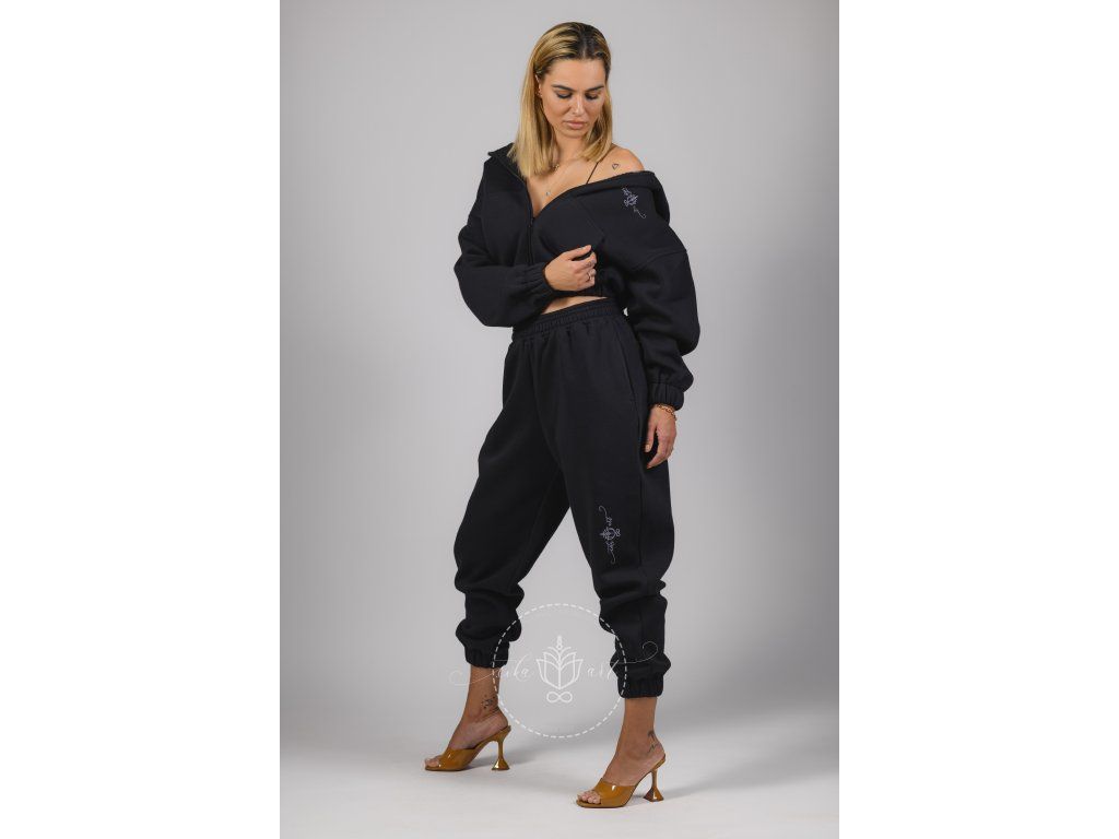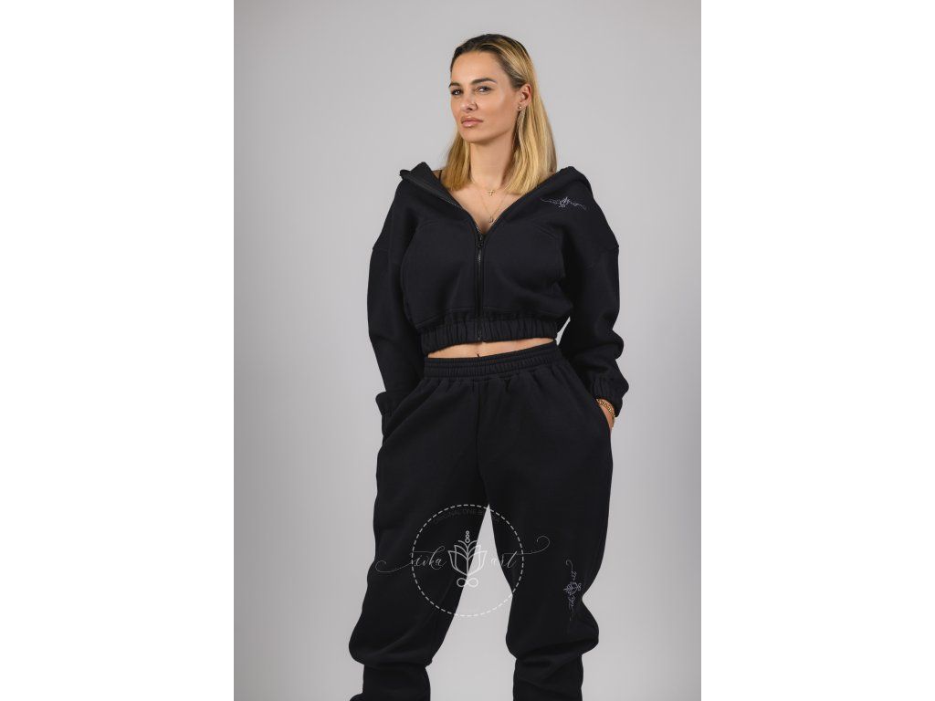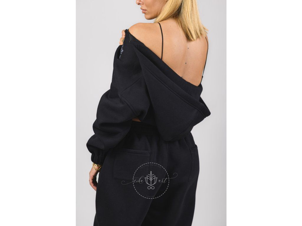 Mikina v čiernej farbe na zips s kapucňou v BOMBER CROP strihu spája pohodlie a ženskosť.