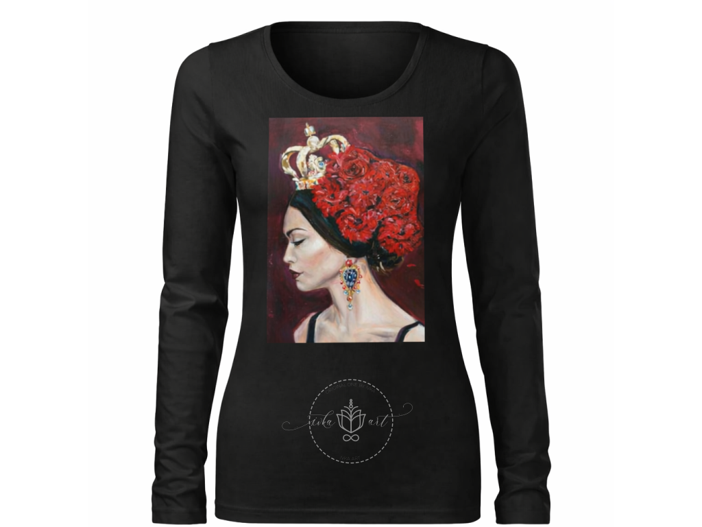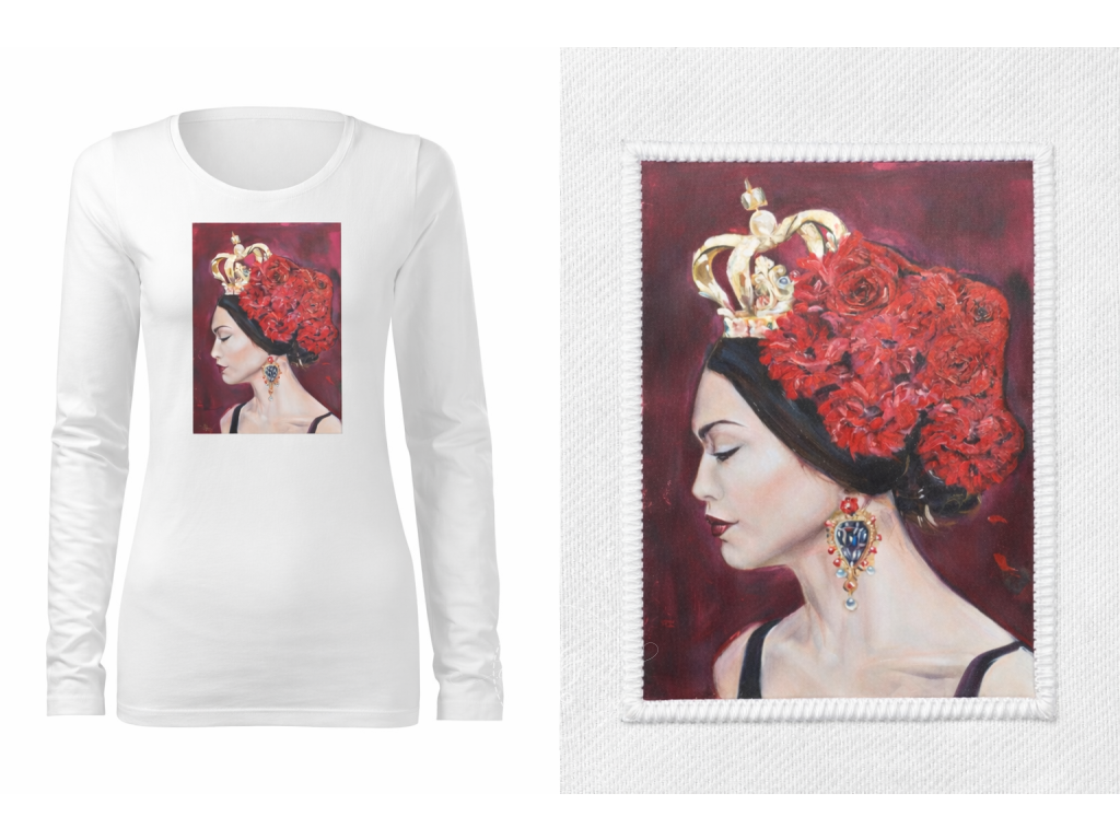 Autorský obraz Ivka ART je prenesený na jemnú zamatovú (velúrovú) látku šetrnou technológiou tlače a následne ručne našitý na tričko.