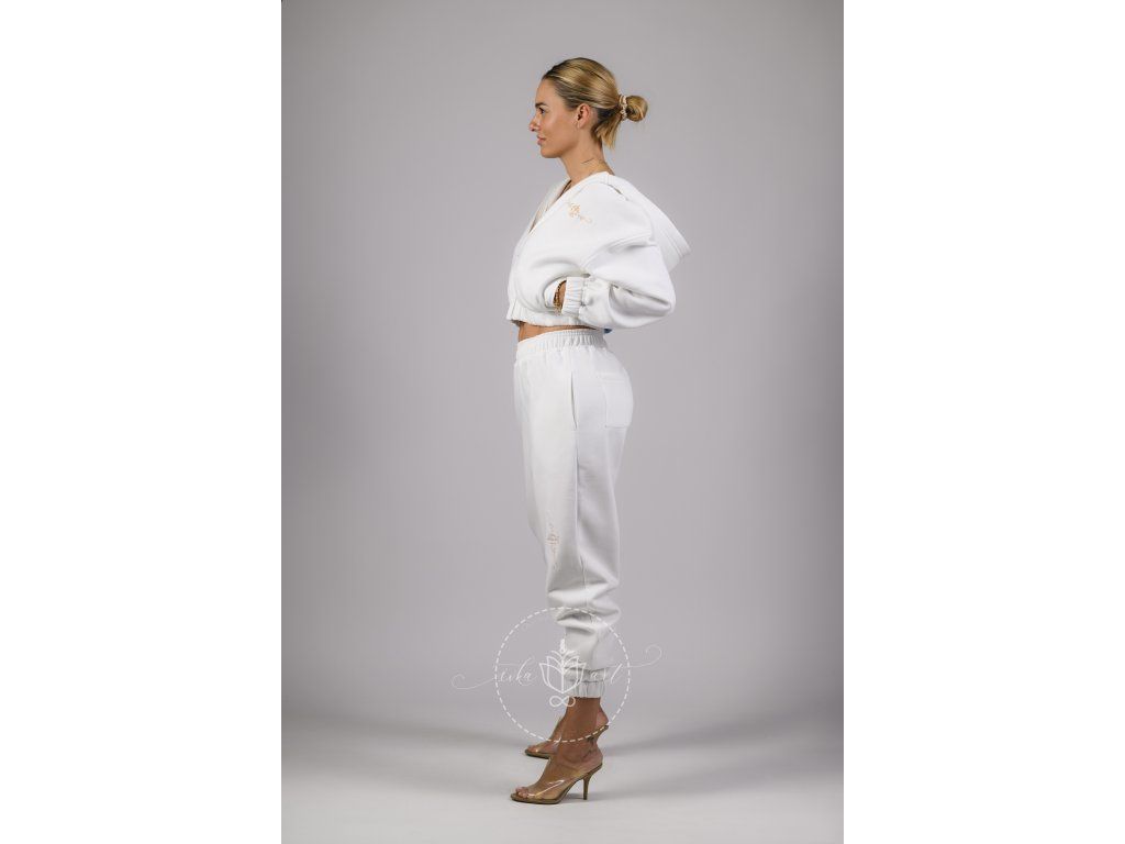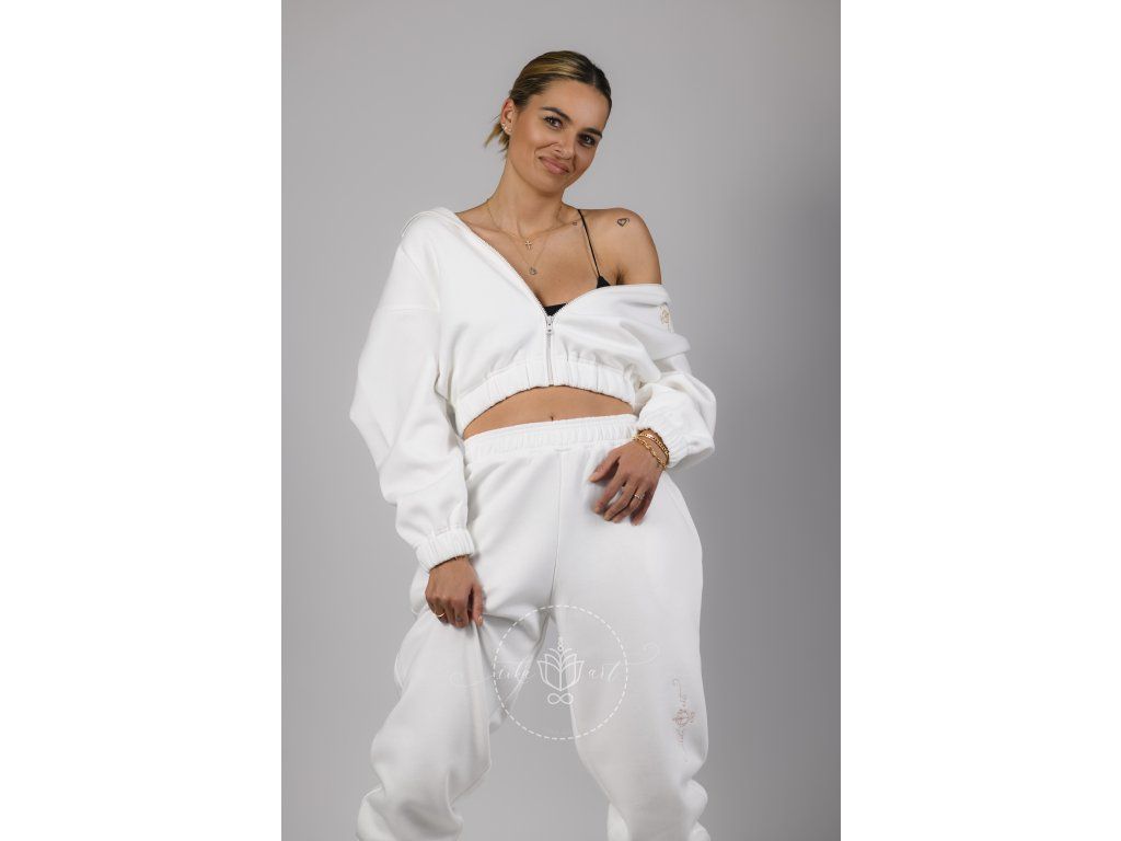 Mikina v jemnom ivory odtieni na zips s kapucňou v BOMBER CROP strihu spája pohodlie a ženskosť. Dĺžka siaha mierne pod pupok, zvýrazňuje pás a zachováva komfort pri nosení, doplnená o dve bočné vrecká.