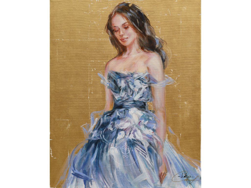 olej na plátne s ručnou aplikáciou plátkového zlata (23,6 karátov), 60 × 80 cm, zarámovaný